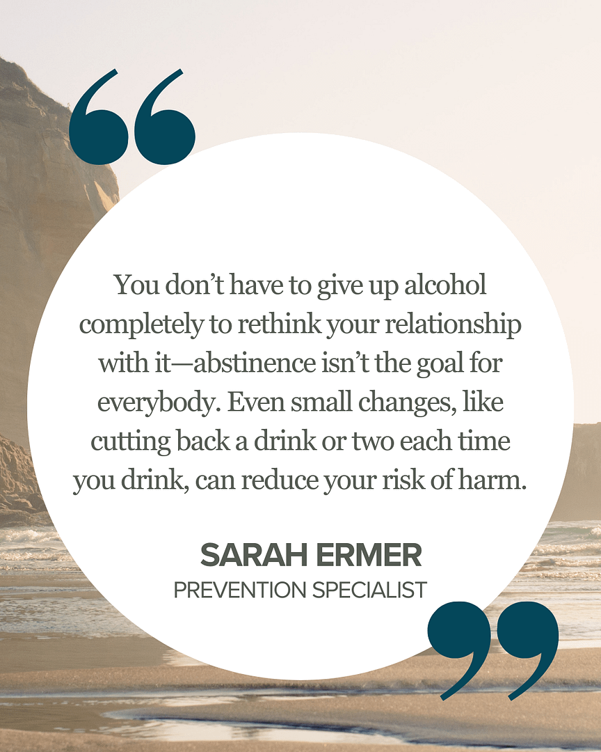 Sarah emphasizes that “you don’t have to give up alcohol completely to rethink your relationship with it—abstinence isn’t the goal for everybody,” and adds that “even small changes, like cutting back a drink or two each time you drink, can reduce your risk of harm.”