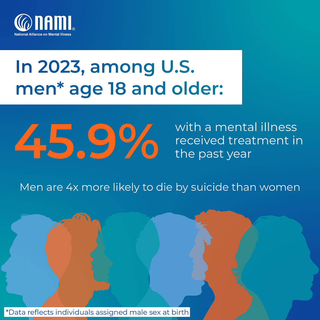 Men are nearly four times more likely to die by suicide than women, yet they are significantly less likely to seek mental health treatment. In 2023, data from the National Alliance on Mental Illness revealed that 19% of U.S. men aged 18 and older experienced a mental illness, but only 45.9% of those received treatment. Additionally, 21.4% dealt with a substance use disorder, and 4.5% had serious thoughts of suicide.