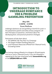 The QPR Gatekeeper training will be presented virtually using the Zoom platform on May 12th, from 10:00 to 11:30AM. This training is a community mental health intervention that was listed on SAMSHA’s National Registry of Evidence Based Programs and Practices as an effective suicide prevention training. This training was designed to be beneficial for all adults, including parents, teachers, employers, health staff, and hospitality staff. This training will be offered at no cost to the participant (registration for this training will be limited to 20 participants that reside or work in Tillamook County). To learn more email Janeanek@tfcc.org. - Introduction to Underage Substance use and Problem Gambling Prevention Presentation: