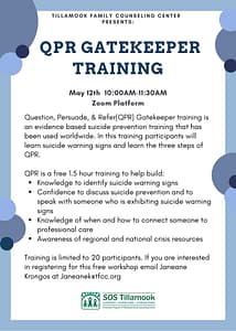 SOS Tillamook The Tillamook Family Counseling Center is pleased to announce that there will be a variety of prevention programs that are offered to community members in the month of May. To learn more about the programs please see the brief description of events and flyers in this post. If you should have questions about the prevention programs, please email Janeanek@tfcc.org