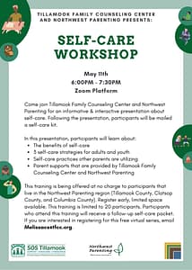 Come join Tillamook Family Counseling Center and Northwest Parenting for an informative & interactive presentation about self-care. Following the presentation, participants will be mailed a self-care kit. In this presentation, participants will learn about: the benefits of self-care, 3 self-care strategies for adults and youth, self-care practices other parents are utilizing, and Parent supports that are provided by Tillamook Family Counseling Center and Northwest Parenting. To learn more email Melissacs@tfcc.org.
